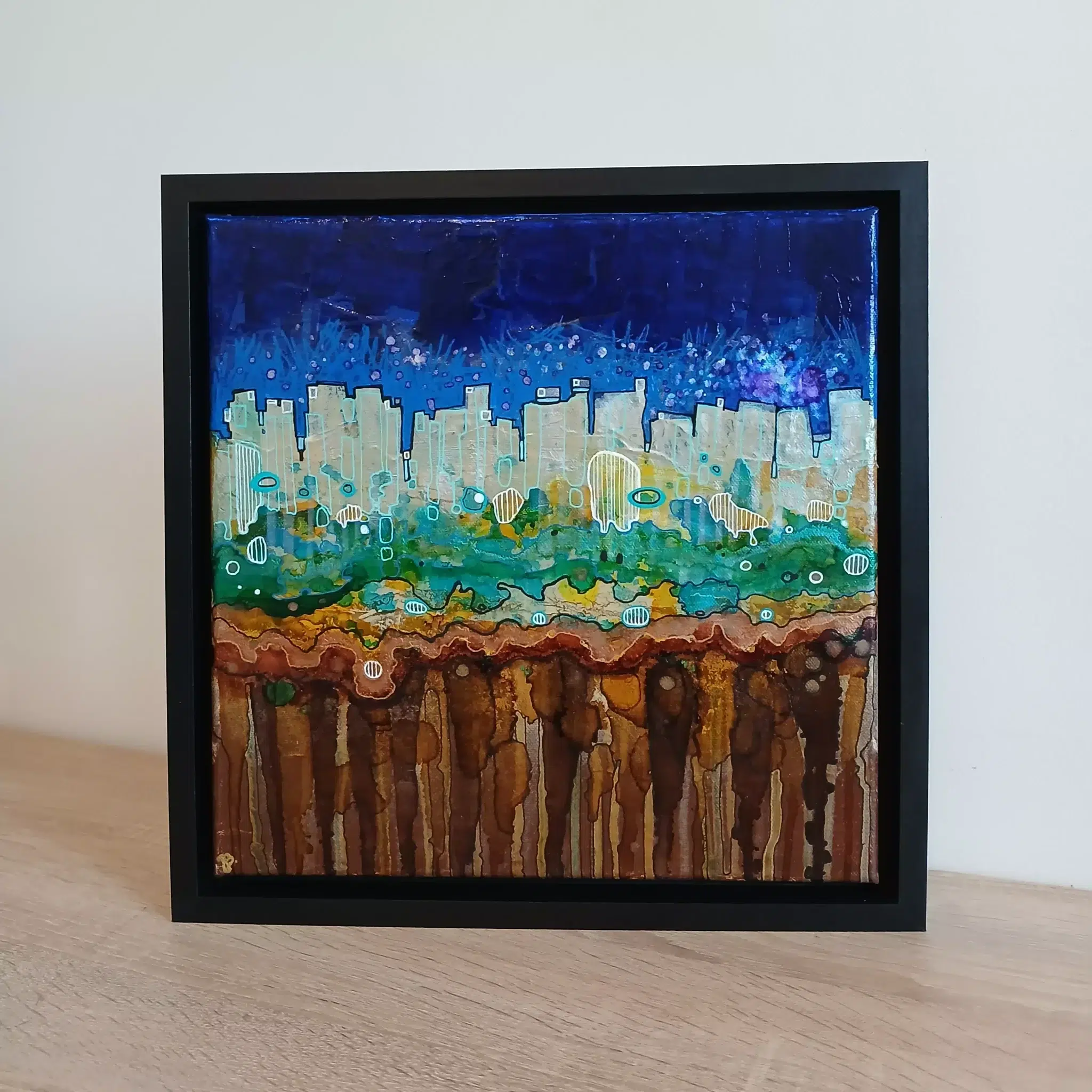 Cette œuvre de 30 x 30 cm est une histoire visuelle. C'est un voyage entre la réalité et l'imaginaire, où chaque détail révèle une nouvelle dimension du paysage urbain. Les couches de peinture acrylique et les encres à l'alcool se mêlent pour créer des textures et des coulées qui semblent raconter la transformation d'un monde. Ce petit tableau est une fenêtre ouverte sur un univers inattendu, un clin d'œil aux amateurs de science-fiction et de dystopie.